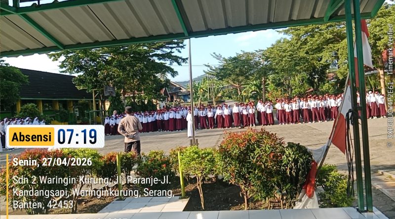 POLRESTA SERKOT_ Dalam rangka menanamkan nilai kedisiplinan serta meningkatkan kesadaran hukum sejak usia dini, Kanit Binmas Polsek Waringinkurung Iptu Juwedi melaksanakan kegiatan sebagai pembina upacara bendera di SDN 2 Waringinkurung, pada hari Senin pagi (27/04/26).